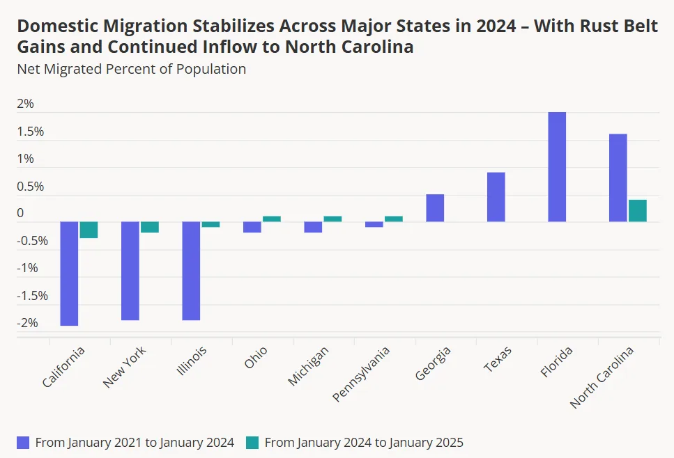 - North Carolina stood out with a 0.4% population increase from domestic movers in 2024.