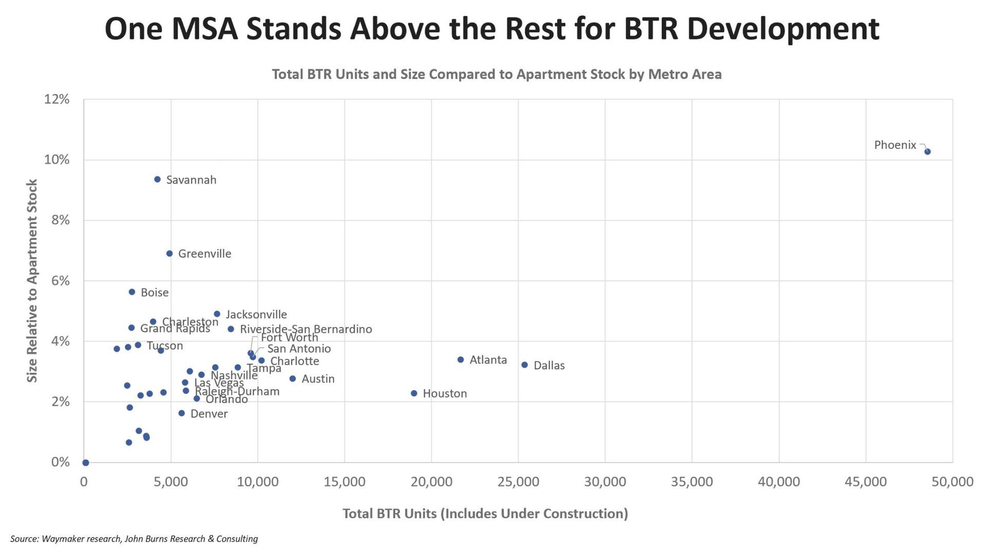 While Phoenix has already built a massive BTR presence—now exceeding 10% of its apartment stock—nearly all other major metros remain in the very early stages of BTR development, with inventory still under 4% despite strong long-term demographic demand.