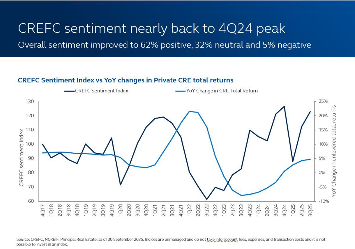 CRE sentiment rose 9.3% in Q3 to 122.8, driven by surging optimism around interest rates, financing demand, and transaction activity.