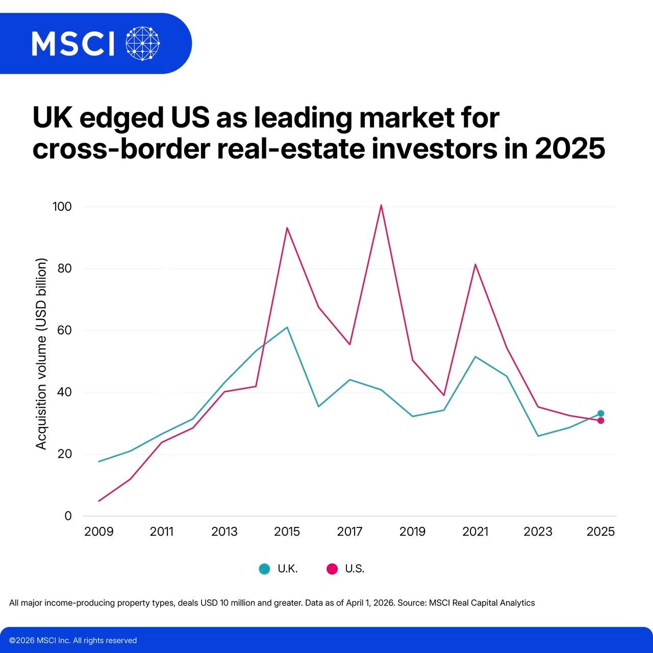 Cross-border CRE capital is shifting away from the U.S. toward the U.K., driven by declining foreign investment, especially from Canada.