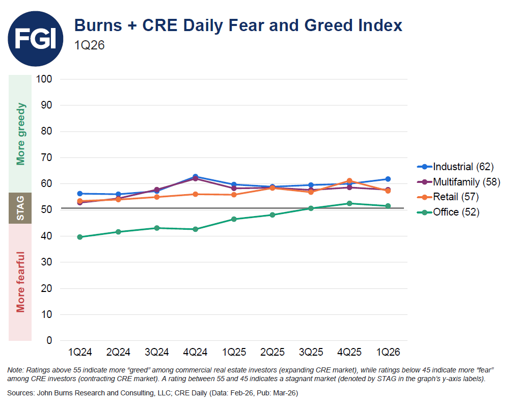 Good morning. Thank you to everyone who contributed to the Q1 2026 Burns + CRE Daily Fear and Greed Index. This quarter’s report shows investors remaining cautious and largely on pause, as oversupply concerns grow and improving capital conditions have yet to translate into stronger deal activity.