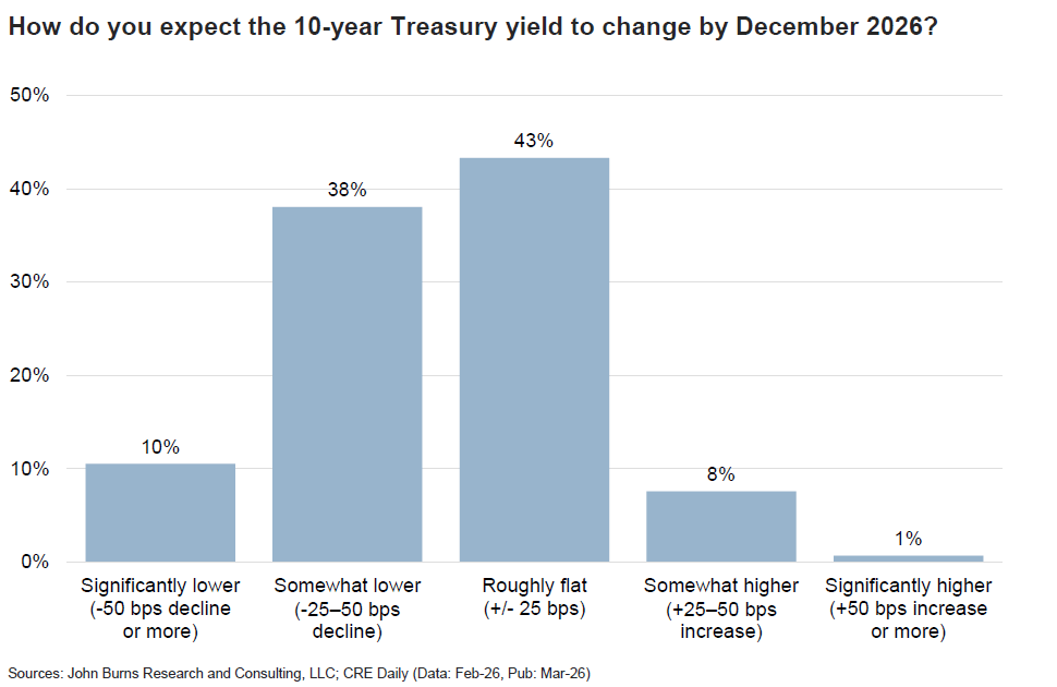 Uneven capital recovery: Capital access is improving, but unevenly across sectors. Industrial and retail investors report better conditions, while multifamily and office still face tighter financing. Still, many expect relief ahead, with more investors anticipating lower borrowing costs and Treasury yields.