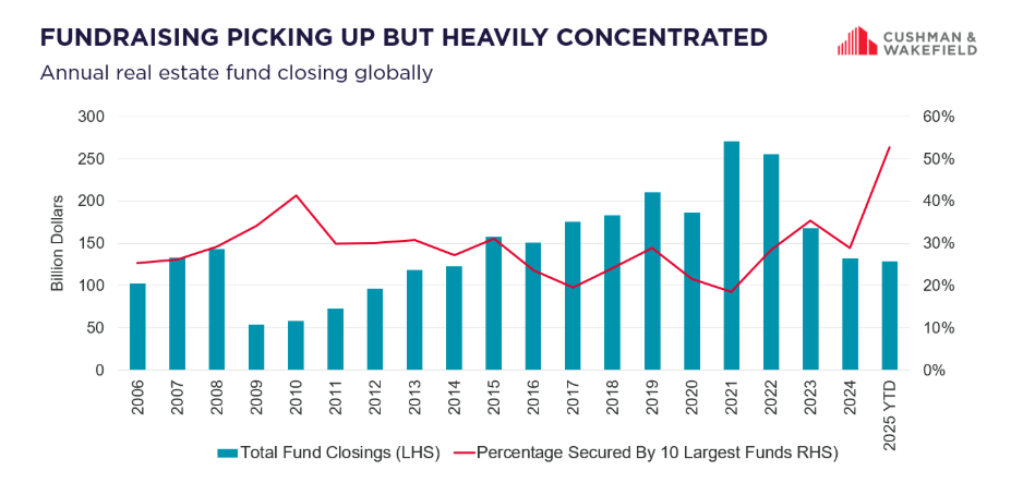 Follow the money: More than half of this year’s real estate fundraising is concentrated among just ten managers—a record high. Armed with billions in dry powder, they’re targeting fewer, larger deals in resilient sectors. Their cautious strategy is fueling single-asset sales while leaving bulk portfolio trades on pause.